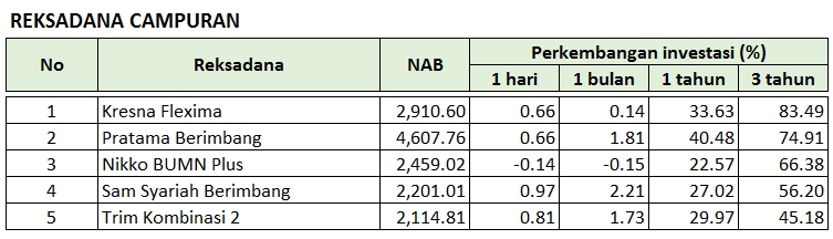 Berikut kami tampilkan produk reksadana dari kategori reksadana Campuran, Syariah, dan Saham yang memberi return (pengembalian hasil) tertinggi dalam periode 1 hari, 1 bulan, 1 tahun, hingga 3 tahun terakhir, dengan mengacu pada Infovesta.com per 03 Februari 2015.